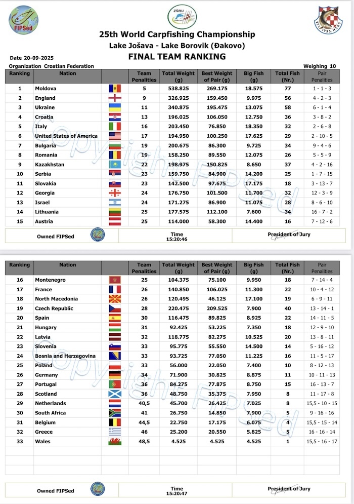 It was a complete team performance with each of the US squad’s three pairs of anglers ranking well within their section, and the pairing of Bogdan Bucur and Srdjan Gazivoda matching the best historical section performance of an American pair, with a second place in section A. The overall event, which was spread over two different lake venues, was won by Moldova, with England second, and Ukraine third.